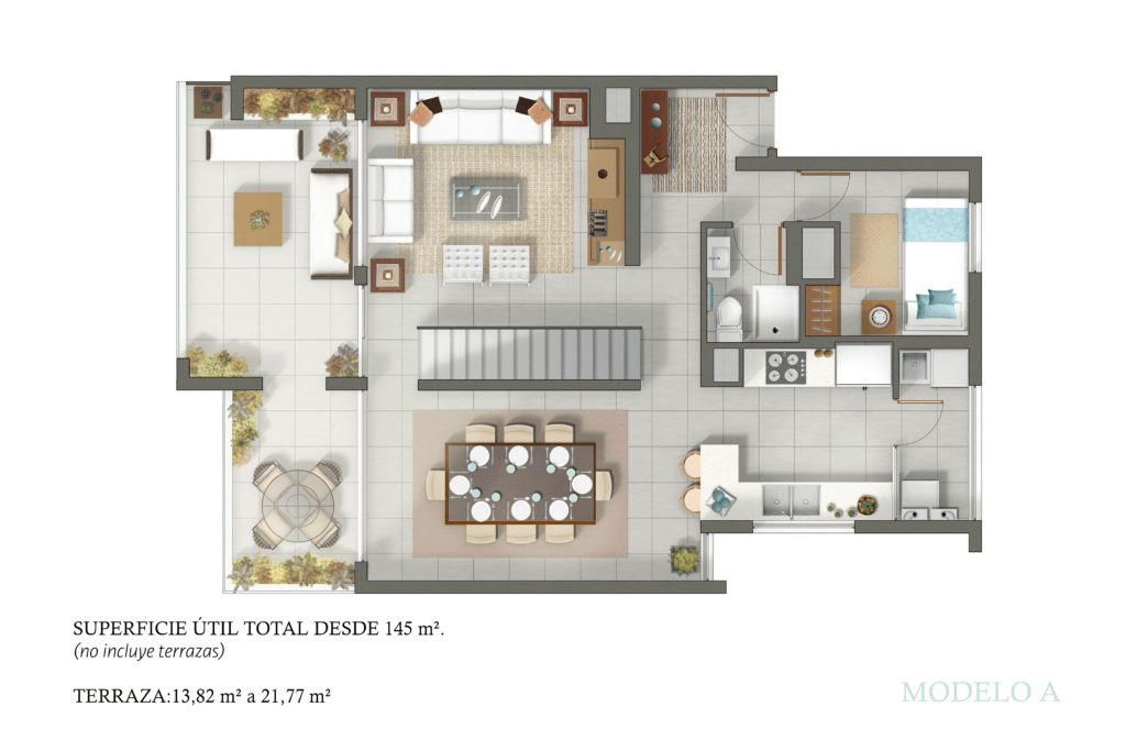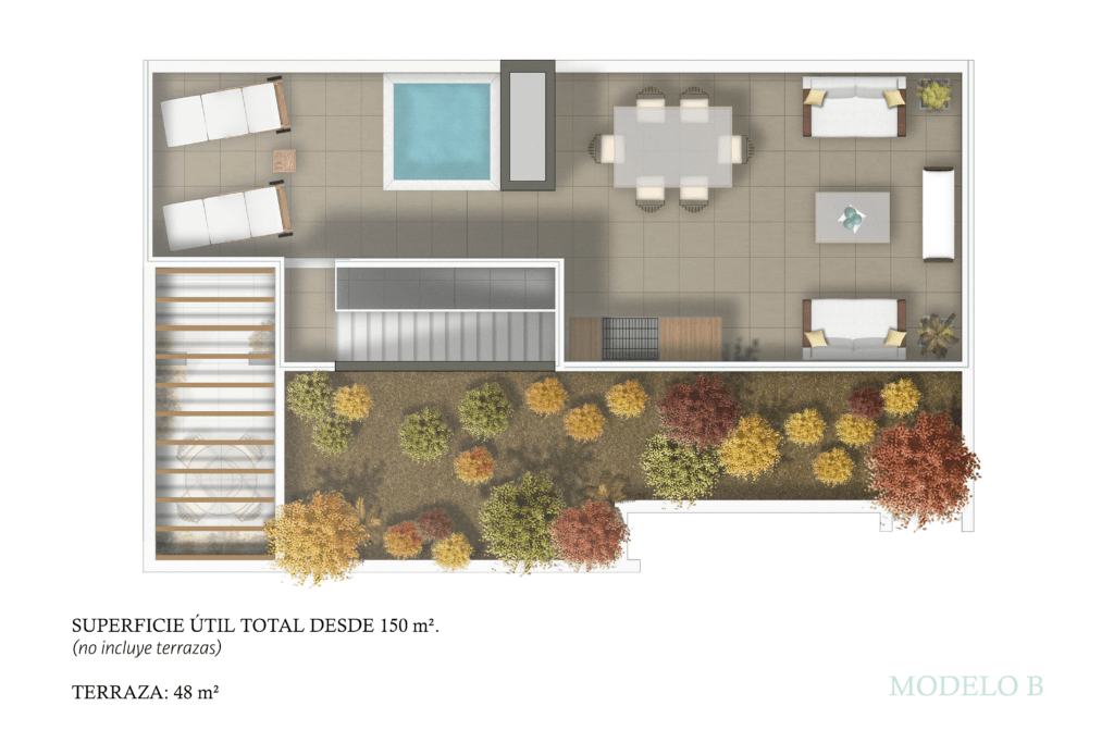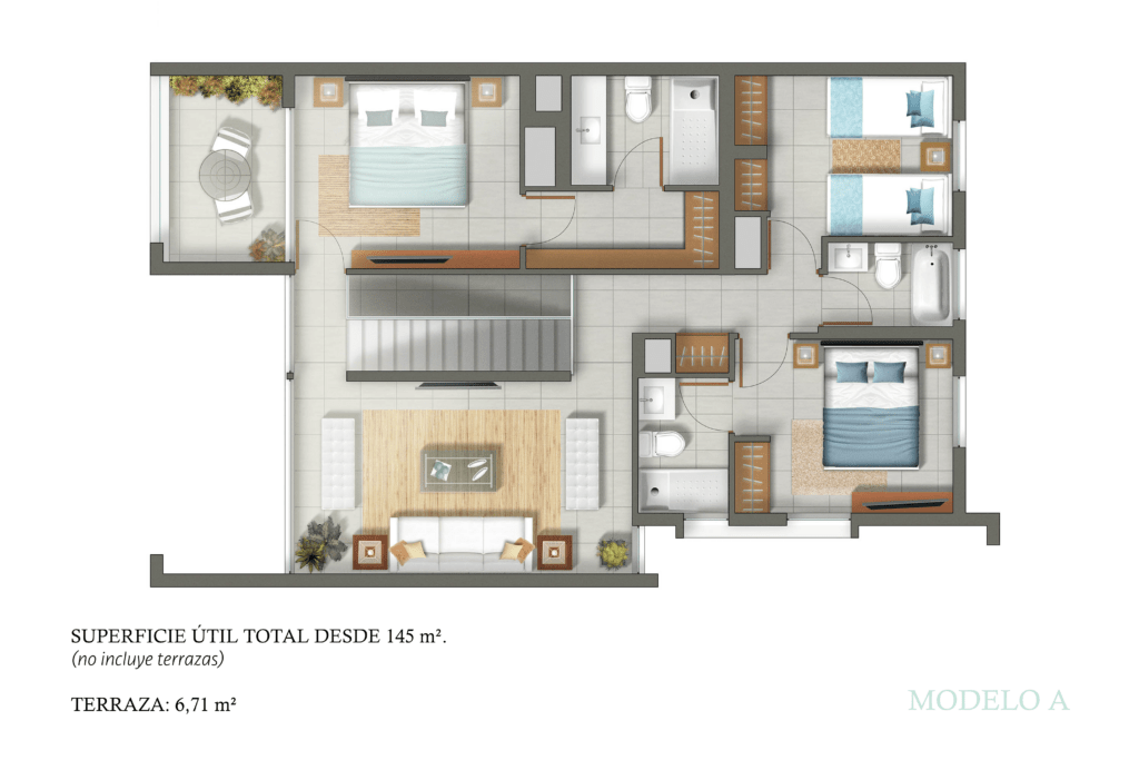 Opción A: Dúplex de 4 habitaciones y 4 baños, con la posibilidad de disfrutar de un patio exterior convertido en terraza, ideal para reuniones al aire libre o momentos de relajación.