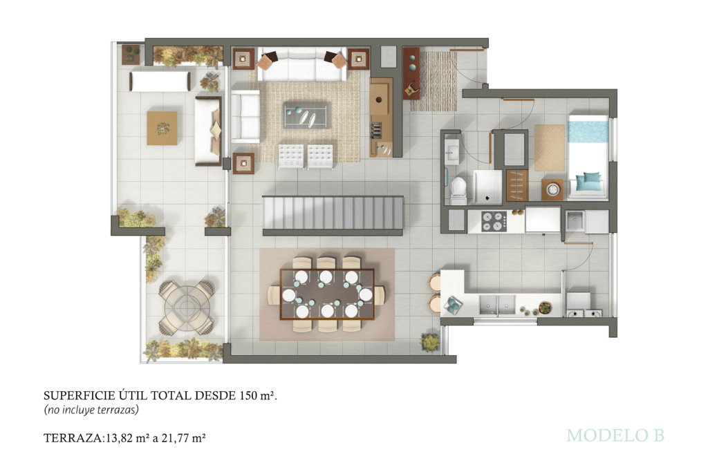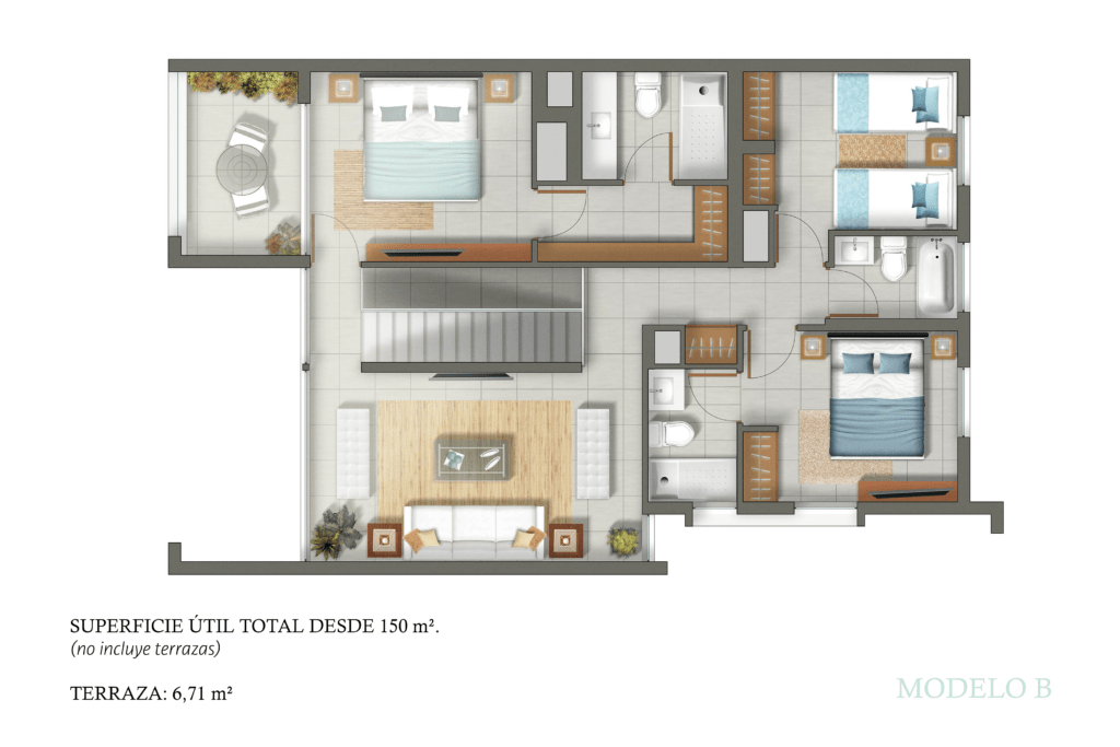 Opción B: Un impresionante tríplex que eleva tu experiencia de vida, con 4 habitaciones, 4 baños, una amplia terraza y un lujoso jacuzzi para tu máximo confort.